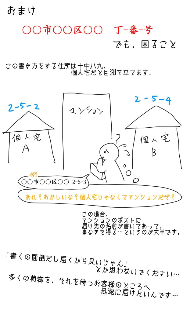 宅配業者からの切実なお願い 住所は省略せず正しいものを書いてほしい この手の住所不備で照会掛けたり最悪宛所不明で返さざるを得なくなっている Togetter